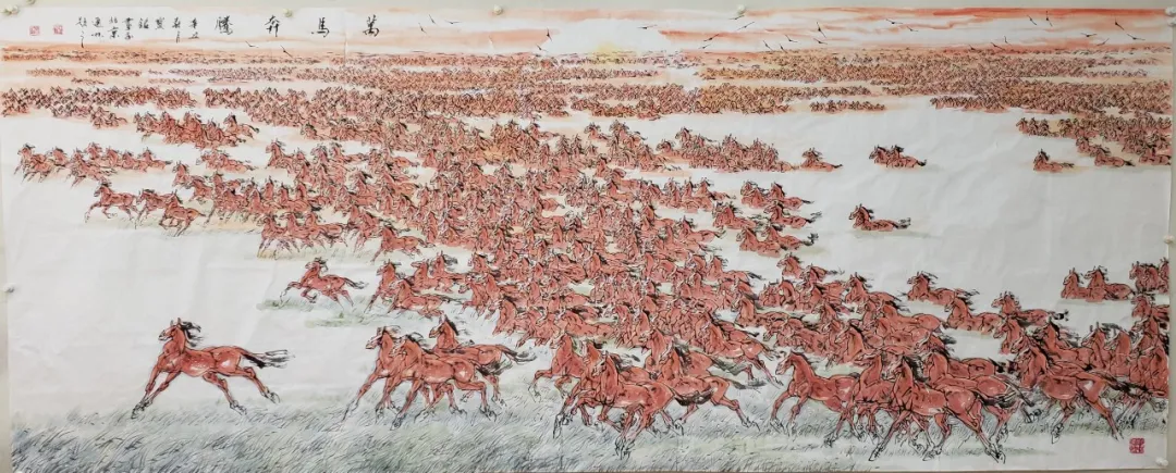 著名書畫家徐寶銘精心繪制的丈二巨幅畫作《萬馬奔騰》,懸掛在天鼎218文化金融園大廳內,恢弘壯觀、大氣蓬勃的氣勢讓人驚嘆不已,表達了對黨的無限熱愛和對祖國的美好祝福。