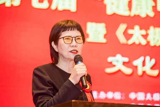 著名音樂(lè)制作人、大型舞臺(tái)秀《太極圖》總監(jiān)制,中國(guó)康復(fù)技術(shù)轉(zhuǎn)化及發(fā)展促進(jìn)會(huì)副會(huì)長(zhǎng)、原中國(guó)國(guó)際文化藝術(shù)有限公司總經(jīng)理江凌女士致辭。她 表示,已連續(xù)參加了好幾屆的"健康中國(guó)太極文化產(chǎn)業(yè)”高峰論壇,雖然在疫情當(dāng)前,仍抵擋不住“太極”的魅力和大家聚首海口。