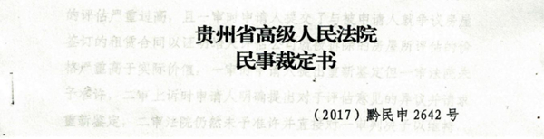 環宇公司不服黔南州中級人民法院的判決,又申訴到貴州省高級人民法院,高級人民法院雷勇審判長也是在沒有與環宇公司人員咨詢的情況下,以一審、二審都沒有給予(重新評估申請)、以環宇公司雖然覺得評估機構評估價格過高(但沒有書面要求重新評估并當庭申請)為由,下了維持原判的裁定書。