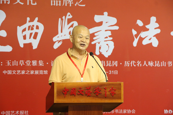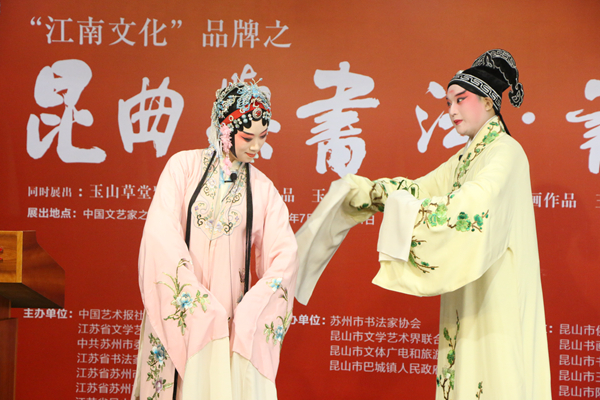 7月26日,由中國藝術報社、江蘇省文聯、蘇州市委宣傳部、江蘇省書協、蘇州市文聯、蘇州市文廣旅局、昆山市人民政府主辦的昆曲與書法·書法展在北京中國文藝家之家展覽館開幕。本次展覽分為“玉出昆岡——歷代名人詠昆山”“玉山雅集·詩聯作品”“昆曲與書法”三個部分,共展出霍國強等著名書畫家創作的作品近200幅。這些作品以歷代名人吟詠昆山的詩歌、古代三大雅集之一的“玉山雅集”以及昆曲為主線,采用書法和繪畫創作相結合的手法,展現昆山之美、昆曲之美、傳統之美。