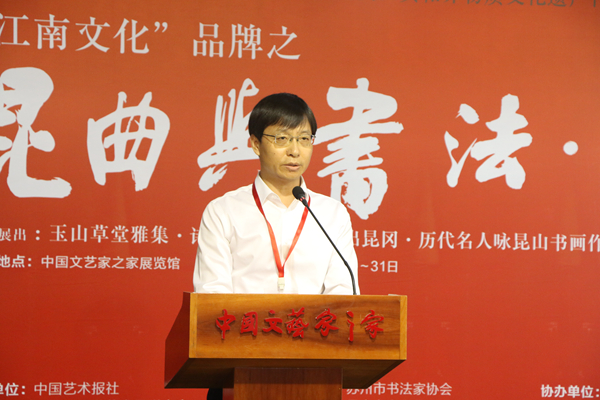 中國藝術報總編輯康偉,江蘇省文聯副主席徐惠泉,昆山市政協副主席宋建華,中國藝術研究院研究員、中國美協理論委員會副主任、中國書協學術委員會副主任李一,昆山市文聯副主席、昆山市美協主席、展覽藝術家代表霍國強在開幕式上致辭。昆山市文聯主席馮惠清代表昆山市向中國藝術報社贈送展覽作品集,中國藝術報副總編輯余寧代表報社接受作品集。開幕式由中國藝術報社副社長孟祥寧主持。