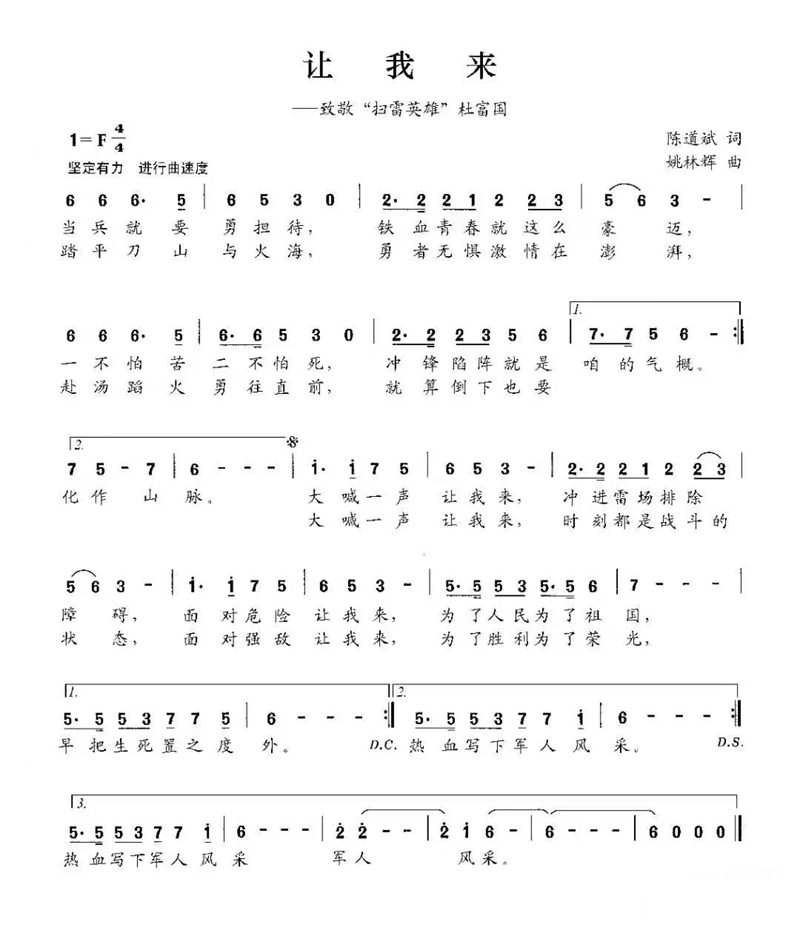 可以說(shuō),歌曲《讓我來(lái)》的歌詞獨(dú)立出來(lái),就是一首豪邁的詩(shī)篇。如何讓這一厚重、雄渾的詩(shī)篇成為能讓人喜歡聽(tīng)、愿意學(xué)的歌曲呢?創(chuàng)作者選擇了明亮大氣的音樂(lè)風(fēng)格,用歌唱的音色給予進(jìn)行曲速度的歌曲優(yōu)美動(dòng)聽(tīng)的感覺(jué)。“掃雷英雄”杜富國(guó)在一次排雷中勇?lián)?dāng),失去的雙眼和雙臂,但他沒(méi)有消沉,而是及時(shí)調(diào)整狀態(tài),積極康復(fù)訓(xùn)練,執(zhí)著追求夢(mèng)想,樂(lè)觀積極向上地生活,帶給家人、戰(zhàn)友的是自信的笑容。歌曲《讓我來(lái)》在一開(kāi)始就出現(xiàn)男聲合唱“讓我來(lái),讓我來(lái)”,所渲染的不光是軍人氣概,更是以杜富國(guó)為代表的新時(shí)代青年軍人敢于面對(duì)生死挑戰(zhàn)的心聲。男聲合唱“讓我來(lái),讓我來(lái)”在歌曲中反復(fù)出現(xiàn),每一次出現(xiàn)都讓歌曲的情緒拉升至一個(gè)高點(diǎn)。