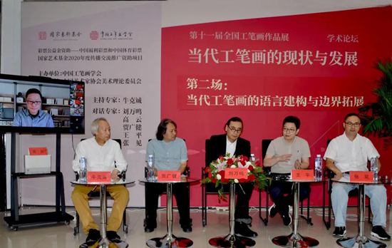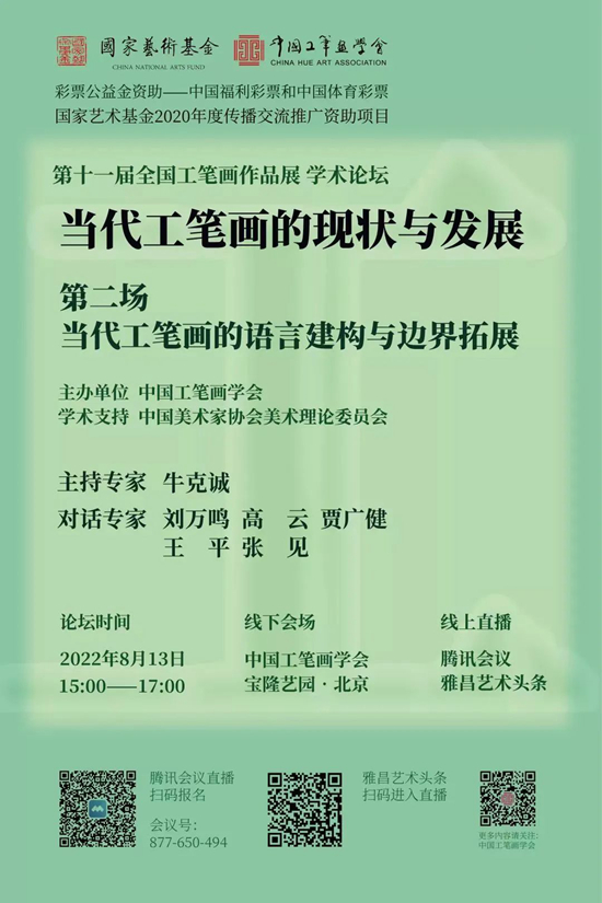 2022年8月13日下午,由中國工筆畫學會主辦、中國美術家協會美術理論委員會學術支持的,國家藝術基金資助項目“第十一屆全國工筆畫作品展”系列論壇“當代工筆畫的現狀與發展”第二場“當代工筆畫的語言建構與邊界拓展”,在中國工筆畫學會成功舉行。六位嘉賓結合“第十一屆全國工筆畫作品展”,就當代工筆的語言探索、工筆傳統的當代價值、當代工筆的跨界融合、當代工筆的精神意蘊等大家關注的話題展開精彩對話。論壇合作的雅昌藝術頭條直播吸引了近40萬觀眾在線觀看直播和回放。