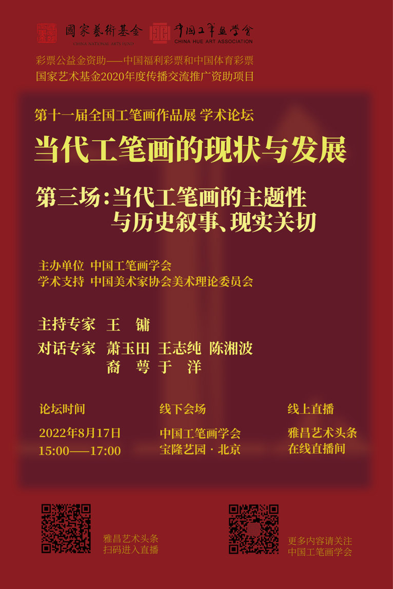 2022年8月17日下午,由中國工筆畫學(xué)會主辦、中國美術(shù)家協(xié)會美術(shù)理論委員會學(xué)術(shù)支持的,國家藝術(shù)基金資助項目“第十一屆全國工筆畫作品展”系列論壇“當代工筆畫的現(xiàn)狀與發(fā)展”第三場“當代工筆畫的主題性與歷史敘事、現(xiàn)實關(guān)切”,在中國工筆畫學(xué)會成功舉行。六位嘉賓結(jié)合“第十一屆全國工筆畫作品展”,就“主題性工筆畫如何發(fā)揮畫種的特性,工筆歷史畫如何利用歷史敘事資源,現(xiàn)實題材工筆畫如何表現(xiàn)現(xiàn)實關(guān)切”等大家關(guān)注的話題展開精彩對話。論壇合作的雅昌藝術(shù)頭條直播吸引了近120萬觀眾在線觀看直播和回放。