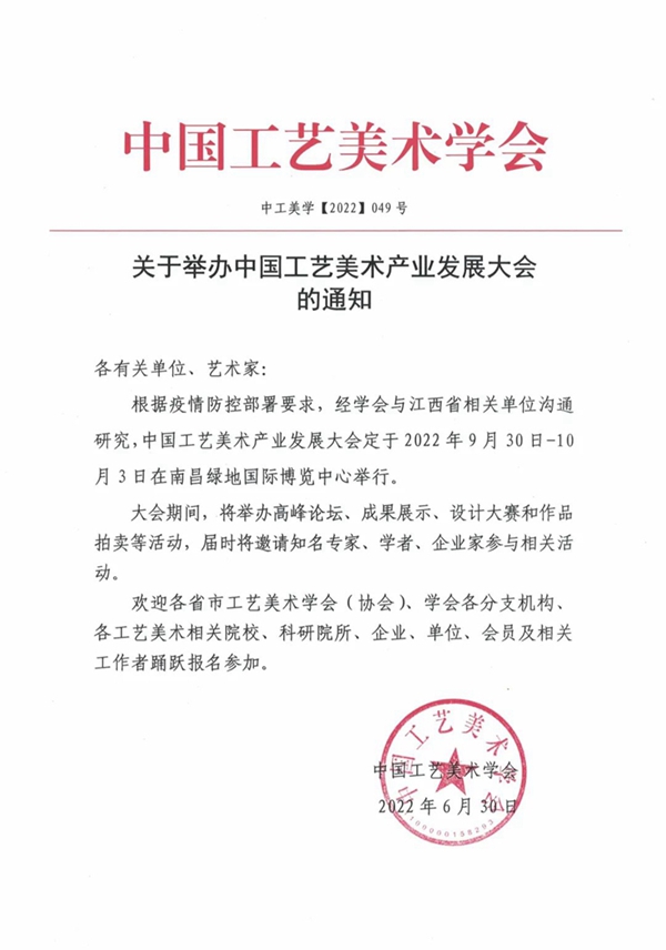 關(guān)于舉辦中國工藝美術(shù)產(chǎn)業(yè)發(fā)展大會的通知