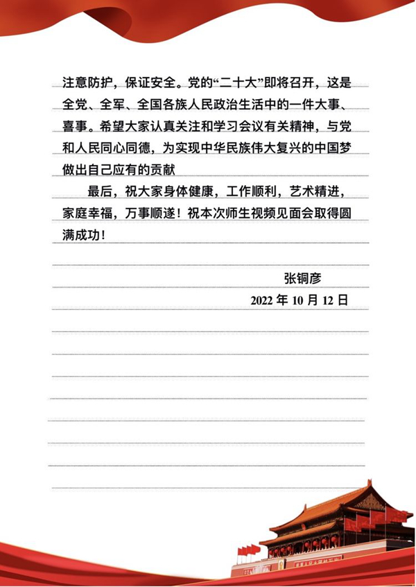 10月12日晚,在喜迎黨的二十大召開之際,中央數字電視書畫頻道張銅彥顏體楷書研修班通過騰訊視頻會議方式,舉行了結業三周年師生見面學習交流會。中國書法家協會第五、六屆理事,中國金融書協第一、二屆主席,中央數字電視書畫頻道特聘教授,研修班導師張銅彥出席會議并做重要講話。