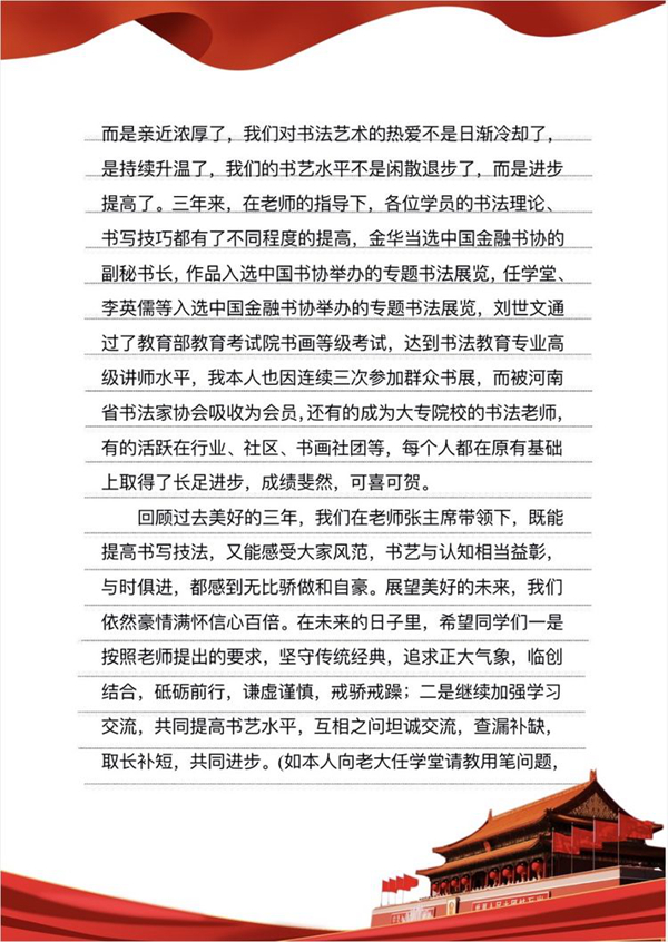 本次研修班見面交流會的召開,進一步密切了師生友情,續寫了教學篇章。三個小時的會議即將結束時,與會人員意猶未盡依依惜別,紛紛要求以后要多搞類似活動。學員們一致表示,一定要牢記老師教誨,崇尚經典,勤奮學習,淡泊名利,砥礪前行,為弘揚顏楷正大書風、建設社會主義文化強國做出自己的應有貢獻。