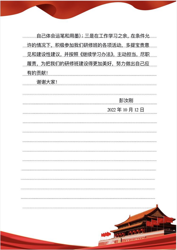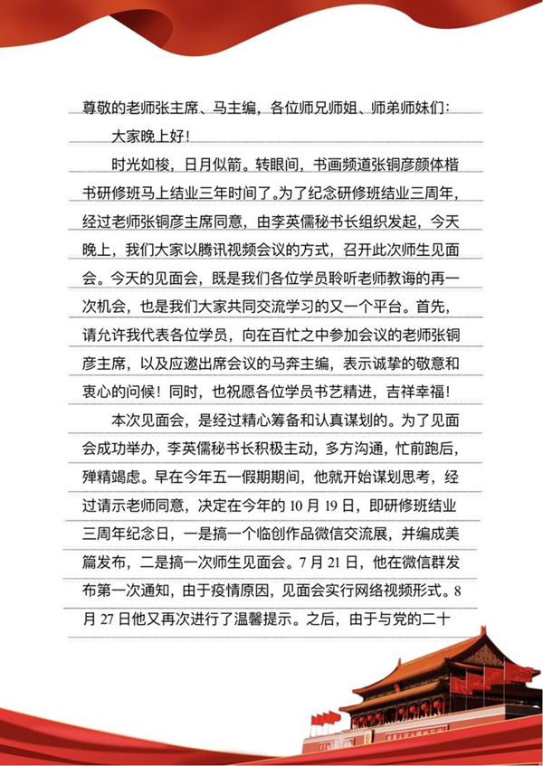 見面會由研修班秘書長李英儒主持,大家進入騰訊視頻會議室互致問候重溫師生情誼后,班長彭汝剛首先介紹了會議籌備情況,并總結介紹了過去三年來大家的學習情況及取得的不凡成績。隨后,研修班導師張銅彥發表熱情洋溢的講話。他指出,三年來,大家在做好單位工作、自己事業和家庭服務的同時,自覺學習,刻苦臨帖,勇于探索,認真實踐,字內功和字外功都有了顯著提高。他強調,學海無涯,藝無止境,在接下來的日子里,希望大家一是要謙虛謹慎,戒驕戒躁,不忘初心,砥礪前行,始終保持濃厚的學習興趣,再難也要堅持,再累也不放棄;二是要繼續堅持讀帖、臨帖,以顏勤禮碑為基礎,適當擴展自書告身帖、麻姑仙壇記、李玄靖碑等經典顏楷碑帖,做到生命不息,臨帖不止,活到老學到老;三是要臨創結合,學以致用,活學活用,重點解決“臨創兩張皮”的問題;四是要加強字外功的學習和積累,做到“藝文兼備”、“德藝雙馨”;五是要積極參加各級書法展覽和社會書法公益慈善活動,服務社會,服務人民;六是要積極參加研修班組織的各種集體活動,多提合理化建議,共同營造和諧向上、友善互助、生動活潑的良好風氣和團體氛圍。