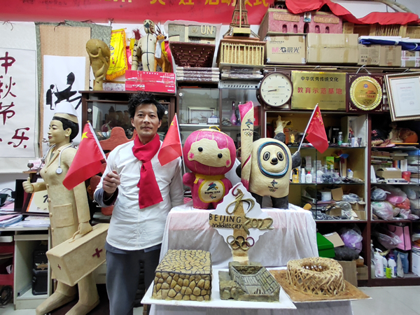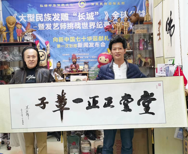 著名詞曲作家姜延輝先生(左)與頭發雕塑發明家黃鑫(右)和發雕藝術作品《堂堂正正一輩子》合影
