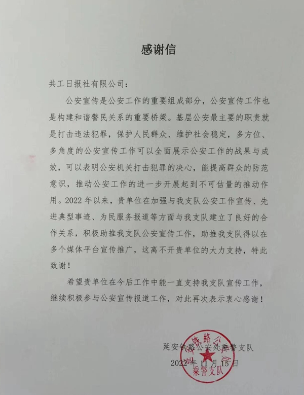 共工日報社財經局11月18日消息(馬立瑜)近日,共工日報社有限公司收到一封來自延安鐵路公安處乘警支隊的感謝信。信中對共工日報社在2022年以來,共工日報社與延安鐵路公安處乘警支隊公安工作宣傳,先進典型事跡,為民服務報道等方面所做出的貢獻給予了肯定和感謝。