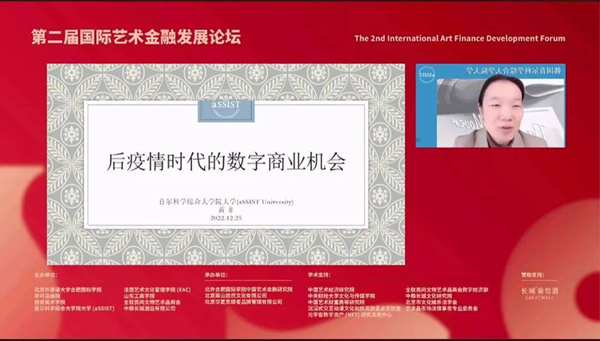 2022年12月25日,由北京外國語大學合肥國際學院、李可染畫院、西安美術學院、首爾科學綜合大學院大學、法國藝術文化管理學院、山東工商學院、全聯民間文物藝術品商會、中糧長城酒業有限公司聯合主辦;北外合肥國際學院中國藝術金融研究院、北京南山悠然文化有限公司、北京華夏思想者品牌管理有限公司聯合承辦;中國藝術經濟研究院、中央財經大學文化與傳媒學院、中國藝術財富高等研究院、沉浸式交互動漫文化和旅游部重點實驗室、元宇宙數字資產(NFT)研究發展中心、全聯民間文物藝術品商會數字經濟部、中糧長城文化研究院、北京市文化娛樂法學會藝術品市場法律事務專業委員會學術支持,中糧長城葡萄酒贊助支持的“第二屆國際藝術金融發展論壇”在李可染畫院學術報告廳以及線上會場同步成功舉辦。