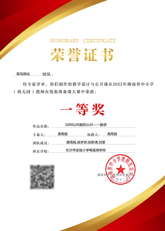 在本次在線備課大賽中,該校參賽教師積極參與、精心備課、認(rèn)真研討、眾籌眾智、深入鉆研課堂教學(xué)藝術(shù),充分展示了長沙市實驗小學(xué)梅溪湖學(xué)校優(yōu)良的教育教學(xué)教研氛圍。其中,數(shù)學(xué)團(tuán)隊《1000以內(nèi)數(shù)的認(rèn)識——數(shù)感》主備人:龔雨揚,(團(tuán)隊成員:龔雨揚,肖夢妍,張靳清,劉瑩)榮獲省級一等獎;