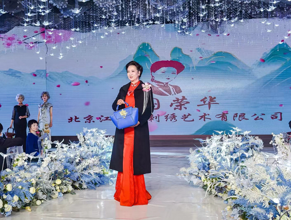 英俊瀟灑的男模闊步走來,他們手中拿著的是江大師近年創(chuàng)作的“億搭件”盤金繡《龍鳳吉祥》。她打破了常規(guī)繡品的模式,創(chuàng)造了可移動模式的作品,既可以搭配在各種服裝上,也可以作為室內裝飾,做到了一件飾品多種用途,給人們以美麗與實惠。
