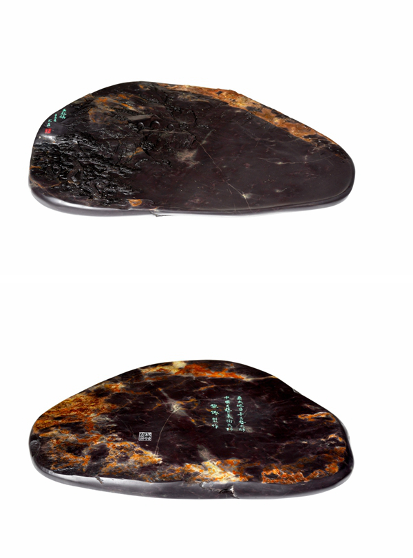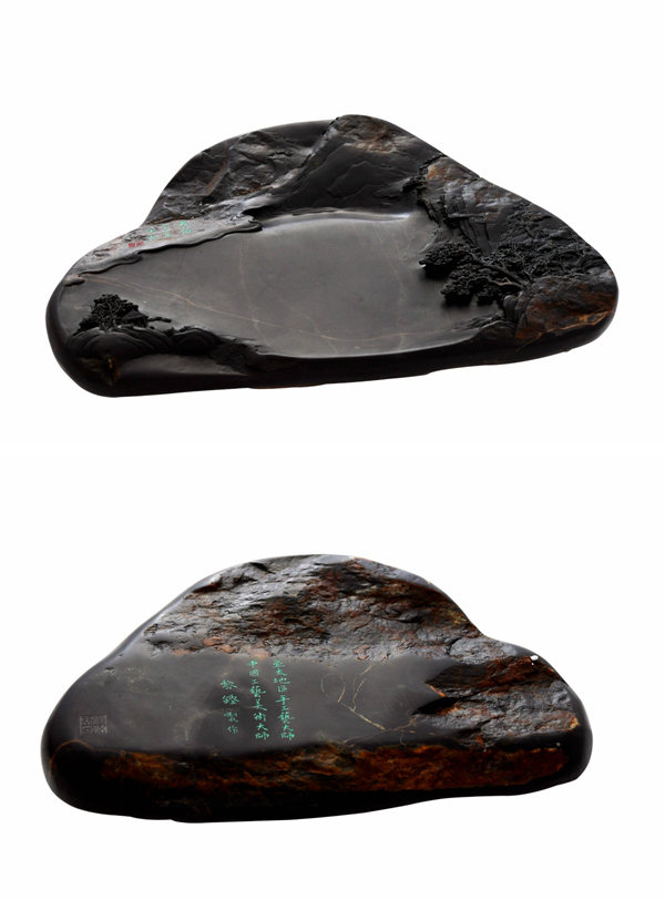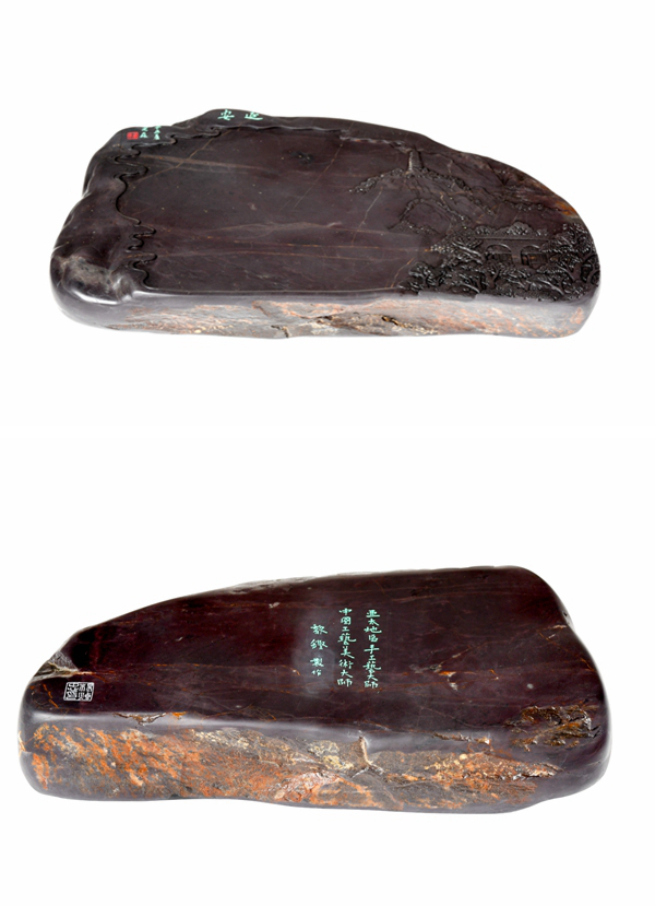 此長征主題硯雕刻的二十二方硯臺,材質均選用源自廣東肇慶西江流域的老坑端石,選材堅潤華美之上乘,硯堂設計與主題構圖之巧妙,硯雕刻畫工藝手法之精湛,紅色意蘊與筆墨造境之審美,實為首開中國工藝美術界歷史之先河。黎鏗、楊焯忠兩位制硯大師均擅長硯藝的山水造境,在創作長征主題硯雕刻藝術的合作上做到了珠聯璧合,因材施藝,求同存異,相得益彰。從雕刻技藝的表現手法上便可感知到兩代藝術大師間技藝傳承與文脈相通。