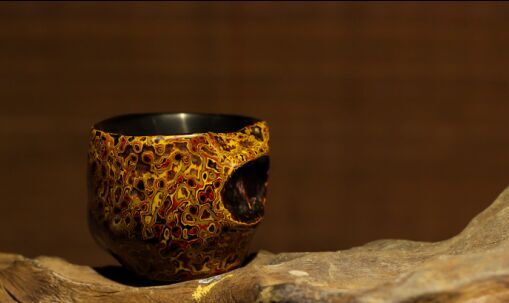 另外,觀古樓漆器采用全器打磨,而且除接近胎體的一層使用生漆之后,其余全程使用精制大漆髹涂,內外涂層達到數十層。打磨要求也更為嚴格,由于是在天然胎的凸凹面上進行打磨,所以除了完全圓形的胎體可以間接輔以旋轉設備,基本上要求全程手工,比較耗工時。但這樣處理作品質量很好,一是避免磨露胎,使水分無從破壞胎體,二是色層打磨可以控制,加上形態變化豐富多彩,細滑光潔,故而極為堅固耐久。植物性胎體由于容易受到水分及潮濕氣候的影響,理論上胎體越輕薄,吸水變形系數就越低,所以這類漆器可以在使用中反復接受沸水澆淋,輕薄堅固,較有特色。在造型和色層布置上,由于天然性胎體的多變,所以造型和漆層變化非常豐富,不會審美疲勞,自然性的胎體也適合把玩,越用越亮,深受市場喜愛。
