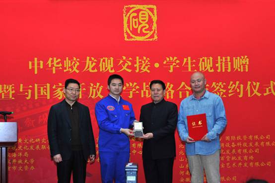 中國(guó)藝術(shù)品理財(cái)網(wǎng)訊 3月16日上午9時(shí),“中華潛海第一硯”蛟龍硯首次在首都北京亮相。中華炎黃文化研究會(huì),中華硯文化發(fā)展聯(lián)合會(huì),國(guó)家開(kāi)放大學(xué)等機(jī)構(gòu)在北京中華硯文化博物館舉行了蛟龍硯交接儀式。
