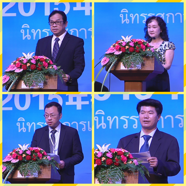 左上:泰國教育部部長助理索庵先生在開幕式上致辭 / 右上:曼谷中國文化中心主任藍素紅女士在開幕式上致辭 / 左下:山東大學國際事務部副部長姬銳先生在開幕式上致辭 / 右下:留學中國聯盟代表黃中在開幕式上致辭