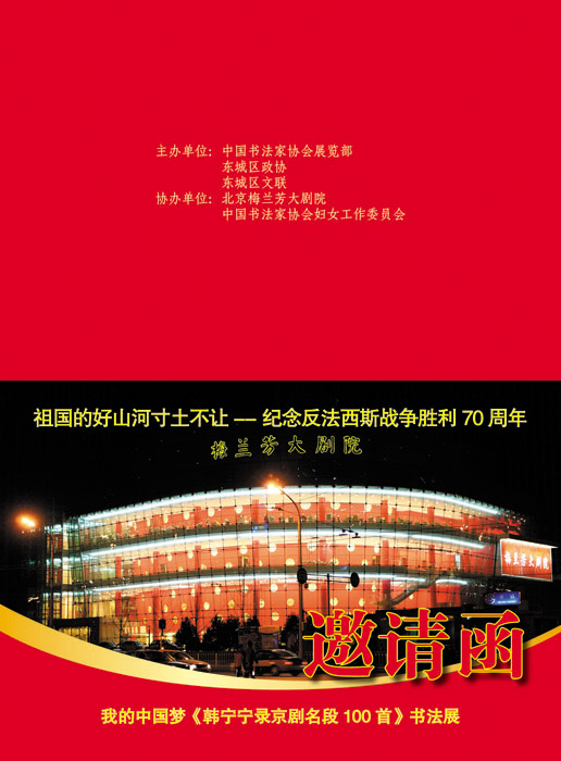 為落實習總書記在文藝座談會上的講話精神,“努力創(chuàng)造更多無愧于時代的優(yōu)秀作品,弘揚中華民族傳統(tǒng)文化的精神。”由中國書法家協(xié)會展覽部、北京東城區(qū)政府、東城區(qū)文聯(lián)共同主辦,北京梅蘭芳大劇院、中國書法家協(xié)會婦女工作委員會協(xié)辦的《祖國的好山河寸土不讓》——紀念世界反法西斯戰(zhàn)爭勝利70周年韓寧寧書法展暨《我的中國夢--京劇薈萃與書法融合》作品集首發(fā)式將于2015年7月19日下午在北京梅蘭芳大劇院舉行。此次共展出韓寧寧錄京劇名段書法作品100幅 。