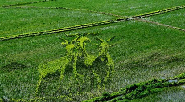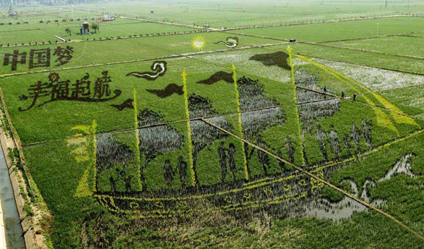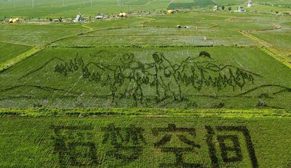 2015年6月22日,遼寧省沈陽市,總占地面積150畝的巨幅稻田畫《中國日子 呱呱叫》、《中國夢 幸福起航》、《小夢露》等十三幅“3D稻田畫”正式亮相沈陽沈北新區興隆臺錫伯族鎮。據了解,錫伯族有種植稻田畫祈福的傳統,稻田畫先設計好要表現的圖形,利用先進的3D技術和透視技術,用矢量法定點定樁連線人工填色,種植不同品種有著不同顏色葉子的水稻,繪制出平面,立體,嘍空,線條四種不同風格稻田畫。