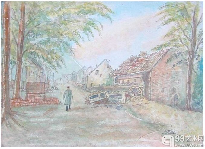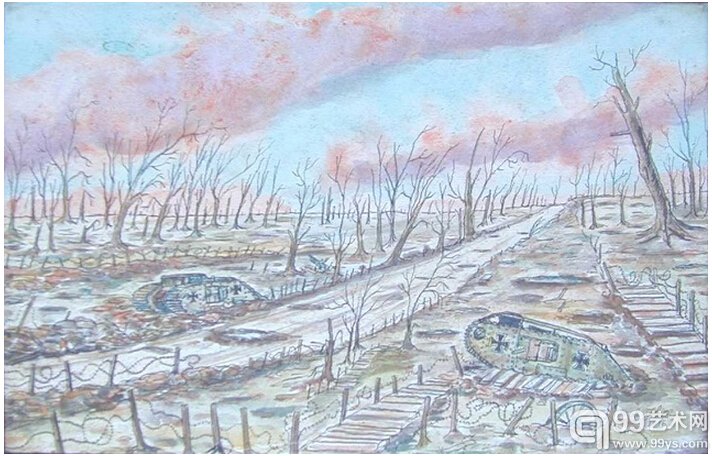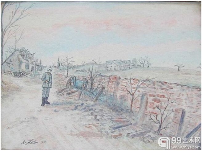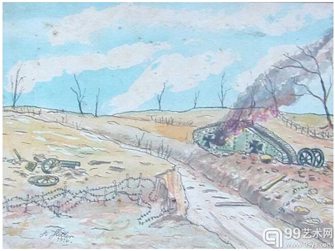 這些藝術(shù)作品為我們洞察這位現(xiàn)代歷史上邪惡和獨(dú)裁的人提供了一個(gè)怪異的窗口,在他的彩色風(fēng)景畫作中,來自一戰(zhàn)的德國(guó)坦克亂扔在貧瘠的土地上,仍然冒著煙燃燒著。這是否是一種自我懷疑的線索呢,還是提醒避免過去的“錯(cuò)誤”,預(yù)示要將德國(guó)變成一個(gè)雄心壯志、踏平異己和絕不妥協(xié)的超級(jí)大國(guó)呢?
