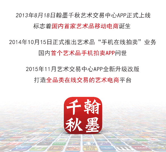 2012年、2013年智能手機、平板電腦等智能產品的大面積普及覆蓋,逐漸轉變消費者的消費習慣以及消費模式。移動互聯網也以迅雷之勢超越PC端成為互聯網最主要的介入口。與時俱進,“見風使舵”是每個行業想要創新所必備的條件。2013年8月18日國內首家藝術品移動電商——翰墨千秋藝術交易中心誕生,成為國內藝術品移動電商的先行者。翰墨千秋藝術交易中心成為第一人,率先看中移動互聯網市場,直接進入移動端口。