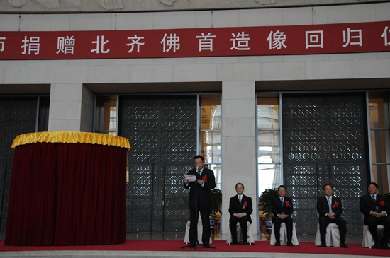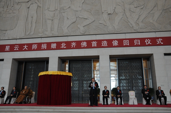雒樹剛部長在致辭中指出,北齊佛首造像這件珍貴文物的回歸,緣于兩岸民眾的血脈親情,緣于中華文化強大的感召力,是習近平總書記所說“兩岸一家親”的又一個生動體現。星云大師以90歲高齡,親自護送這件在海外流失20載的佛首造像由臺灣安全順利地回來,這是一件留在兩岸民眾心間、載入兩岸文化交流史冊的大事。此次兩岸通力合作,共同促成流失珍貴文物回歸,開創了兩岸文化文物交流的新領域,必將產生具有示范性的積極影響。