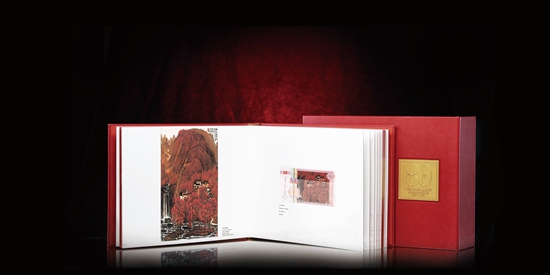 該畫(huà)集內(nèi)的10幅金銀畫(huà),是在對(duì)10位美術(shù)大師的代表作品進(jìn)行研究的基礎(chǔ)上,進(jìn)行的藝術(shù)性再創(chuàng)作。10幅畫(huà)作,以“堅(jiān)韌不拔,自強(qiáng)不息”為總設(shè)計(jì)理念,正面主圖為畫(huà)家原作;背面主圖由象征中華民族尊嚴(yán)的萬(wàn)里長(zhǎng)城,象征繁榮昌盛的國(guó)花牡丹,象征莊重、威嚴(yán)的中華柱組成;牡丹花圍繞著祖國(guó)大好河山,象征中華民族繁榮昌盛之勢(shì)及向往和平之情。