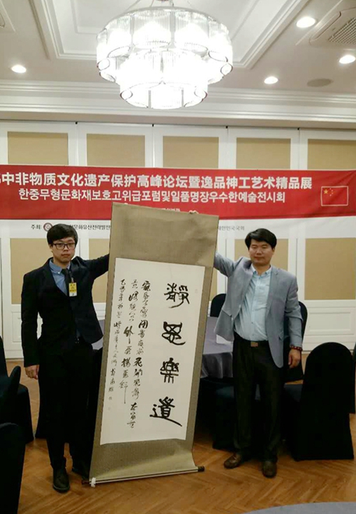 我國青年學者王延鵬先生的書法作品應邀在此次活動中展出,王延鵬先生大膽嘗試用秦篆筆意結合漢隸,以榜書的形式呈現,配以行草書小字詩文,將時代的跨越與文化的傳承有機融合在一幅作品之中,創作出富有禪意的作品《靜思樂道》,該幅作品在展覽中被評為此次活動的最高獎項“逸品神工獎”,并由韓國國會收藏。另一幅傳統行書四尺斗方作品《唐王維詩》獲得中韓非物質文化遺產保護與傳承特別貢獻“匠心傳承”獎,藝術是無國界的,中國書法更是如此,能夠通過中國書法藝術的交流和展示增進兩國友誼是此次活動舉辦的重大意義之一,王延鵬先生本人也被授予“中韓文化交流大使”榮譽稱號。
