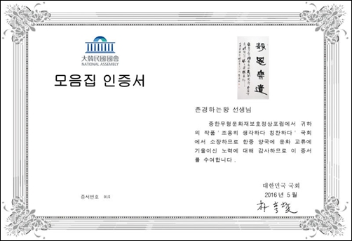 中韓非遺高峰論壇秘書長黃中向韓國國會贈送青年學者王延鵬先生書法作品