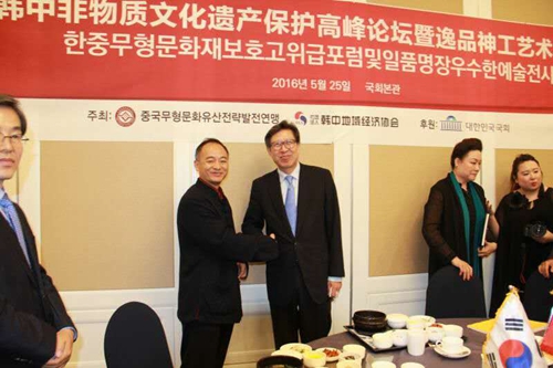 2016年5月24日上午,由文化部、中國文化產(chǎn)業(yè)智庫研究中心支持;大韓民國國會、中國非遺資源管理評價(jià)研究委員會、中國非物質(zhì)文化遺戰(zhàn)略發(fā)展聯(lián)盟聯(lián)合主辦;中華炎黃文化研究會硯文化聯(lián)合會、中國非遺戰(zhàn)略發(fā)展聯(lián)盟玉專委協(xié)辦的中韓非物質(zhì)文化遺產(chǎn)高峰論壇在首爾韓國國會舉行。著名硯雕家王安平應(yīng)邀出席高峰論壇暨逸品神工藝術(shù)精品展,在韓中地域經(jīng)濟(jì)協(xié)會李相基會長與組委會秘書長黃中的陪同下,韓國國會秘書長兼總統(tǒng)辦公室事務(wù)總長樸亨峻親臨論壇致歡迎辭,隨后參觀了王安平大師代表中國非遺傳承人現(xiàn)場展示端硯制作技藝。