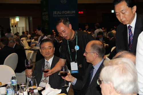 制硯大師王安平和韓國總理黃教安與日本首相村山富市在濟(jì)州論壇歡迎晚宴上親切交流