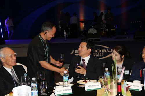 制硯大師王安平與意大利前國家總理恩里克·萊塔在濟(jì)州論壇歡迎晚宴上親切交流