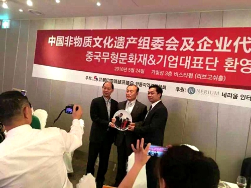 中國非遺戰略聯盟玉專委主任江功堯向韓中地域經濟協會的會長李相基贈送國禮瓷盤