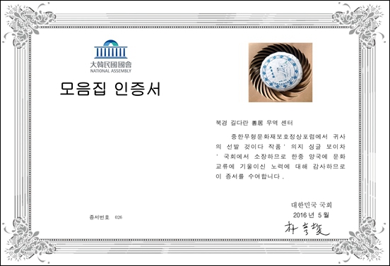 大韓民國國會樸亨埈秘書長親筆簽署的收藏證書