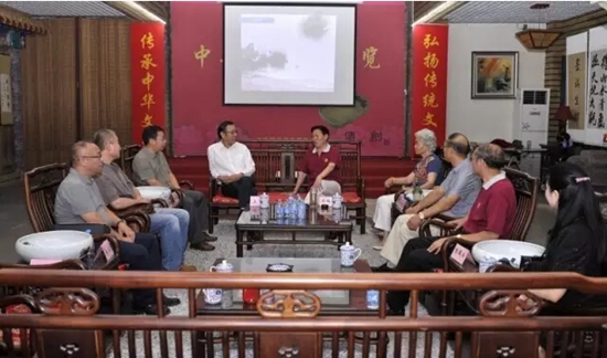 9月1日下午,中國藝術研究院院長、中國非物質文化遺產保護中心主任連輯,中國藝術研究院教授邱春林、王亞雄,文化藝術出版社常務副社長楊斌等一行,專程到北京王四營中華硯文化展覽館進行調研考察。中華炎黃文化研究會硯文化聯合會名譽會長劉紅軍,名譽副會長許世寬,常務副會長、首席專家張淑芬,常務副會長張國興、金彤,副會長于江、火來勝、吳笠谷、葛新國等陪同考察并進行了座談。連輯院長對弘揚硯文化事業取得的成績表示敬佩和贊賞,雙方就共同加強弘揚中華硯文化事業發展達成了廣泛共識。