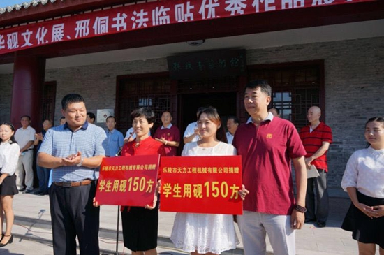 9月8日上午,由中華炎黃文化研究會硯文化聯合會、山東省樂陵市委、市政府共同舉辦的2016樂陵市中華硯文化展覽,在樂陵市孫軼青藝術館隆重開幕。中華炎黃文化研究會硯文化聯合會常務副會長張國興、劉克唐、金彤、蘇文源,副會長火來勝、傅聿勝、馮明躍,以及專委會專家陳國源,常務副秘書長于忠文、李杰、陰巍等20余人組成代表團出席開幕式。參加開幕式的還有,解放軍報社原社長、孫軼青先生之子孫曉青將軍,樂陵市委書記曲峰和市人大、市政府、市政協,市直機關、各鄉鎮領導,參加明代書法家邢侗書法臨帖展的書畫家,以及社會各界群眾共200余人。張國興副會長代表聯合會和劉紅軍會長致開幕詞,蘇文源副會長代表聯合會向樂陵市中小學校捐贈300套學生硯,金彤副會長向樂陵市孫軼青藝術館贈送劉紅軍會長題字“硯緣”。