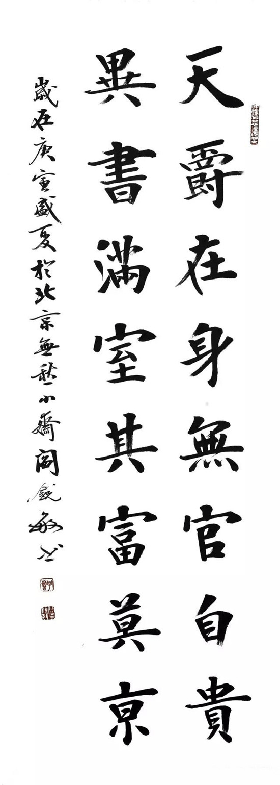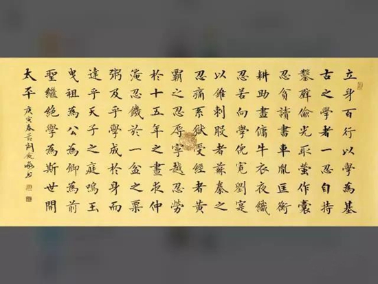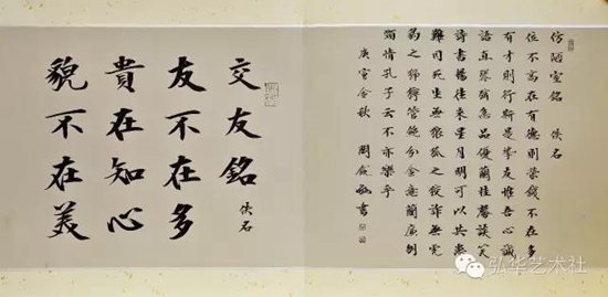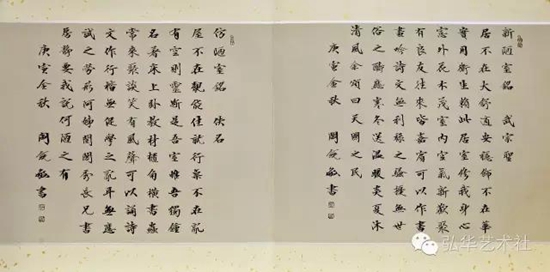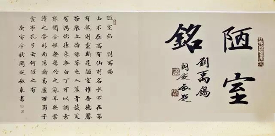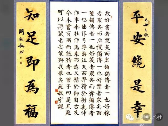橫披指橫幅作品,橫長豎短。這種格式可以寫少數字,自右而左寫一行,也可以橫式直寫形成多行書長篇字。橫披大的可用于建筑物上、大廳會議室中懸掛,小的可用于齋室布置。