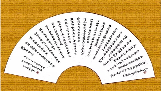 扇面指的是隨扇形書寫的作品。扇面形式有兩種:一種是圓形的團扇,也叫園光。書寫時要能充實飽滿,也可以圓中取方,設方構圖,現在還出現一種新形勢,即:下半園寫字,上半園鈐一方印,也挺活潑;一種是折扇式,這種格式書寫時,以折痕分行,呈圓心輻射狀,上寬下窄,外大內小。章法并非一律,可用長短行間隔的方式安排布局,適合扇形弧線式規律,這種格式顯得活潑優美,尤其是小幅作品點綴性強。
