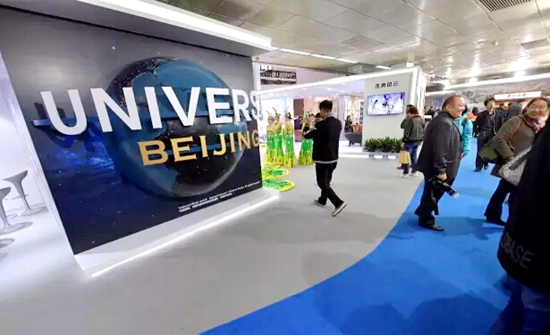 環(huán)球影城展區(qū) 則以園區(qū)全景畫(huà)面為背景,加以動(dòng)漫游戲的互動(dòng)體驗(yàn)、展示了文化旅游區(qū)的特色。