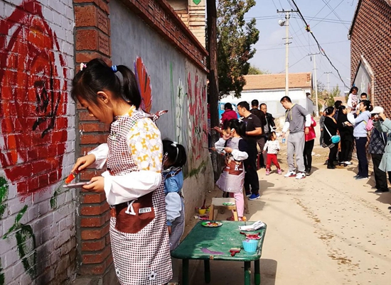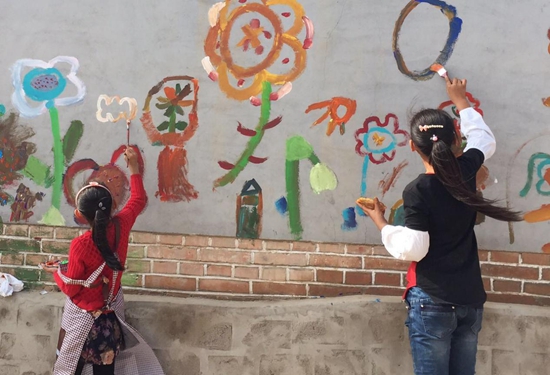 午飯后美術小天使們開始揮動手中的畫筆濃彩重抹,在修繕一新的墻壁上作畫。武家莊是張家口市下花園區所管轄的一個村莊。顧名思義,這里春夏之季山花爛漫,美不勝收。所以組委決定以十三個冬奧舉辦國的國花作為世界兒童美術村的開局題材。在老師的安排指導下,在家長的幫助配合下,美術小天使們個個興致勃勃,經過四個小時的努力奮戰,一朵朵天真稚拙的巨大花朵駐顏墻壁。同時,當天村里也挑選了六位喜愛繪畫的小朋友參與了交流創作活動,將他們心中最美的花朵綻放到了家鄉的墻壁上。美化后的墻壁街景讓人眼前一亮,贏得了人們交口稱贊。