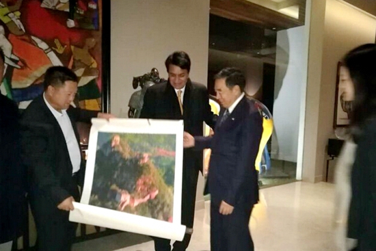 董方軍會長(左)向印度億萬富翁、著名慈善家薩提斯·莫迪(Satish Modi)先生(中)贈送于江老師創新的光影平面油畫作品,并和深圳國際公益學院董事會主席、招商銀行原行長馬蔚華先生(右)合影