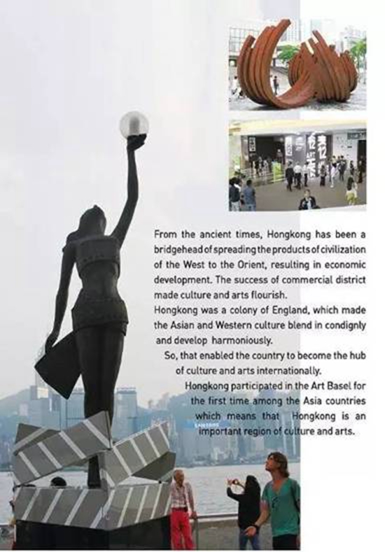 1840年之前的香港還是一個(gè)小漁村。1842至1997年間,香港淪為英國(guó)殖民地,西方文化由此進(jìn)入到這個(gè)東方漁村,兩種文化相互交融,相互影響,相互作用。另外,巴塞爾藝術(shù)博覽會(huì)把香港作為亞洲文化的第一平臺(tái),說明香港在全球藝術(shù)市場(chǎng)的重要性。每年三月巴塞爾都在香港舉行,同期也有許多不同的展覽活動(dòng),吸引了大批來自世界各地的藝術(shù)藏家,藝術(shù)家及藝術(shù)愛好者來購買來自世界各地的藝術(shù)品。