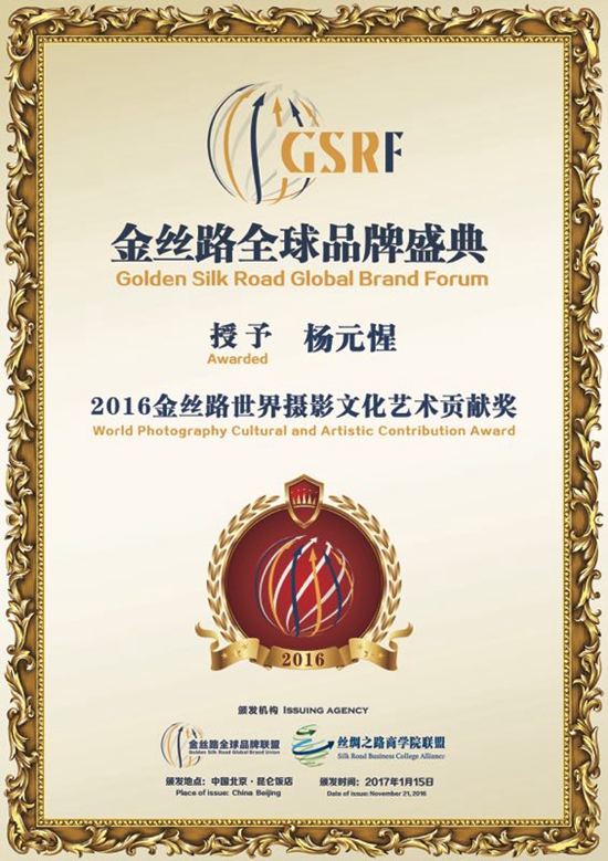 年會舉行了精彩的頒獎盛典儀式,組委會為楊元惺先生頒發(fā)“2016金絲路全球·世界攝影文化藝術(shù)貢獻(xiàn)獎”,為華奎先生頒發(fā)“2016金絲路全球·世界書畫陶瓷文化藝術(shù)貢獻(xiàn)獎”,以表彰兩位藝術(shù)家在“絲綢之路”攝影與書畫瓷器藝術(shù)方面的貢獻(xiàn)。
