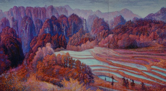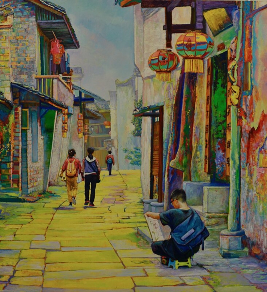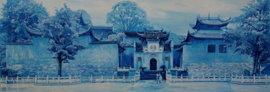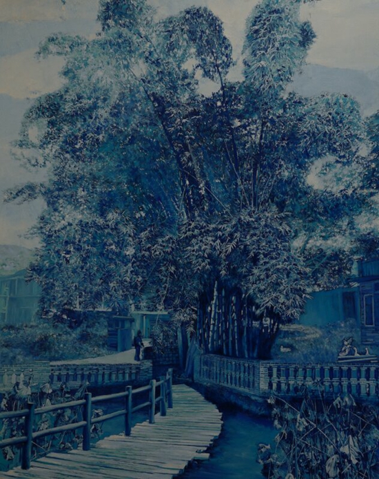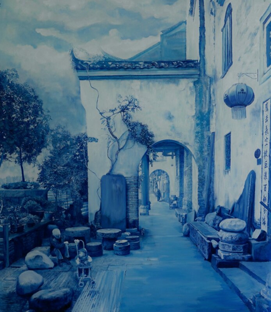 深沉鮮活的中國青花瓷文化是最能代表中國傳統(tǒng)文化的意象之一。作者以田野式調查方式與非遺文化視覺深入湘西,用傳統(tǒng)青花意象觀照今日時代巨變的湘西,表現(xiàn)湘西風光,記錄湘西人文,傳承湘西非遺成果。一方水土養(yǎng)一方人,湘西文化在幾千年的發(fā)展歷程中,大量的非物質文化遺產符號和當?shù)刈匀晃幕z產緊密相聯(lián),在人們的生活方式中和諧發(fā)展,逐漸形成了獨特的湘西文化遺產譜系。在人們審美多元化的今天來欣賞青花非遺油畫作品的確給人一種視覺和精神上的滿足感,其劉家樣個性風格的藝術手法以其精準的造型、高雅的色彩、個性化的筆觸、精湛的制作技藝、奇特的創(chuàng)意以及全新的觀念,描繪出了湘西如詩如畫的古村落、古剎、風雨橋、民居,街市;以及畫面里出現(xiàn)的人物形象,織藝印染,金銀頭飾都能和諧完美地傳達出一種古韻今輝的時代表情。其立意之高遠,內容之豐富,歷史之久遠,符號之多樣,技法之全面為中國畫壇之首創(chuàng)。