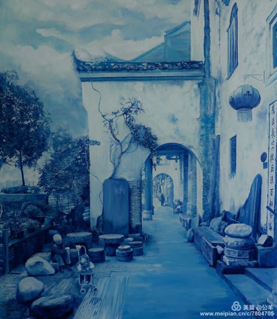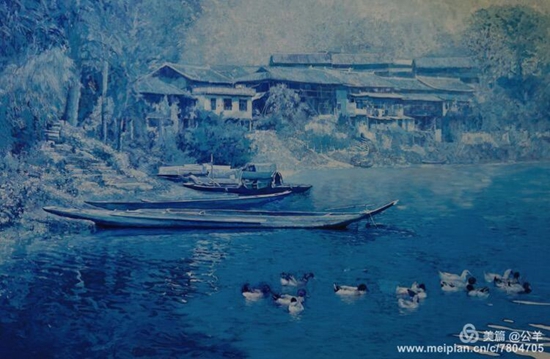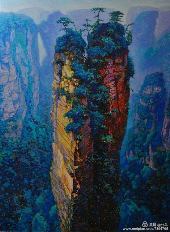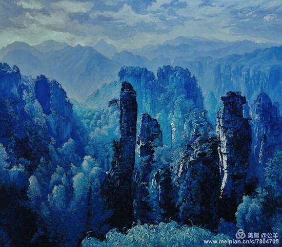 多年來,劉國柱先生以非物質文化遺產的獨特視覺與山岳生態文化的精髓緊密相聯,多次深入湘西,理行雙證、沉潛自適;以傳統青花意象用油畫的藝術表現形式再現濃郁的自然景觀。劉國柱先生是一個有著高度文化自覺的學者,他有著強烈的民族榮譽使命感;有著常人所不具備的對國家自然文化遺產及非物質文化遺產的保護意識!他以獨到精湛的藝術手法描繪出了湘西奇峰的壯美以及古樸的人文景觀,成功地將山岳生態文化和精神文化完美地融合在一起。