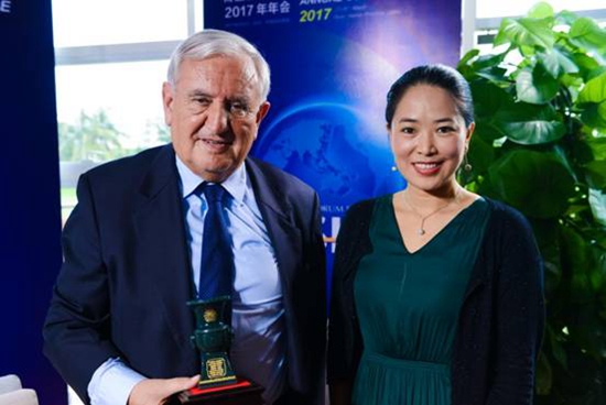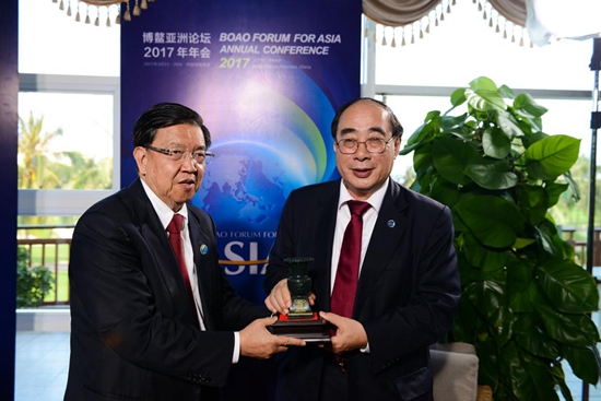 原外經貿部副部長、博鰲亞洲論壇前秘書長龍永圖(左),將中國尊贈與聯合國副秘書長吳紅波(右)