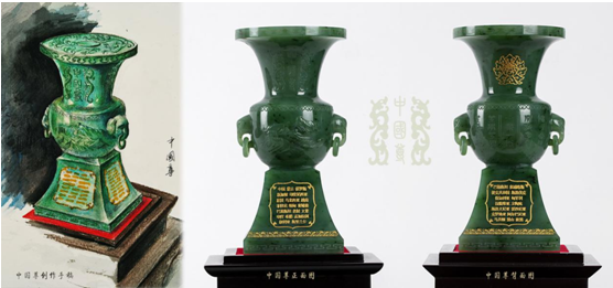 “中國尊”設計呈“天圓地方”式,寓意萬物通達,天人合一的思想。尊體以中國傳統吉祥紋飾,輔以絲綢之路等元素,傳承和平發展、交流合作的理念。口沿與圈足底,花紋為“交泰紋”,寓意天地交泰,萬物通靈;頸部,正面為鐫刻“中國尊”,兩旁雙龍相對;背面鐫刻“寶相花”;肩部,雕刻如意紋;腹部,兩側各一象耳,寓意太平有象;尊體腹部主圖為萬里長城,背部雕刻絲路精神銘文;圈足,圈足四周圖案呈“四合如意”式,分別鐫刻65個國家和地區名稱,并配以“海水”紋飾,寓意四海升平。它將成為21世紀文化藝術絲綢之路上的藝術與文明的載體。