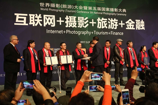 今年他又被趙旭新推薦到世界攝影(旅游)大會暨第五屆國家攝影大典攝影評選人物,經社會人士和國家攝影大典組委會和世界攝影(旅游)大會組委會評選,3月30 日在北京國際會議中心大廳講臺上獲得了2016年中國攝影年度人物的榮譽證書。