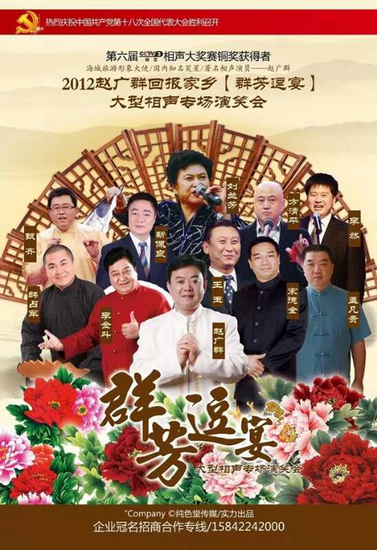 趙廣群,著名相聲演員,影視演員,歌手,主持人。師承著名相聲表演藝術家煤礦文工團國家一級演員宋德全先生,是文哏大師蘇文茂再傳弟子。是中國曲藝家協會會員,中國電影家協會會員,中國民間文藝家協會會員,中國社會藝術協會理事,鞍山市電影電視藝術家協會副主席,遼寧省海城市曲藝家協會主席,旅游形象大使,遼寧省遼陽市藝術館(國家一級館)顧問,第十二屆全國運動會火炬手,CCTV《星光大道》嘉賓評委。2012年12月舉辦“群芳逗宴”趙廣群回報家鄉相聲專場演笑會名聲大震。