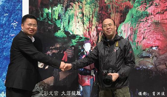 景區(qū)董事長(zhǎng)、文聯(lián)副主席與華奎先生在廣告前握手